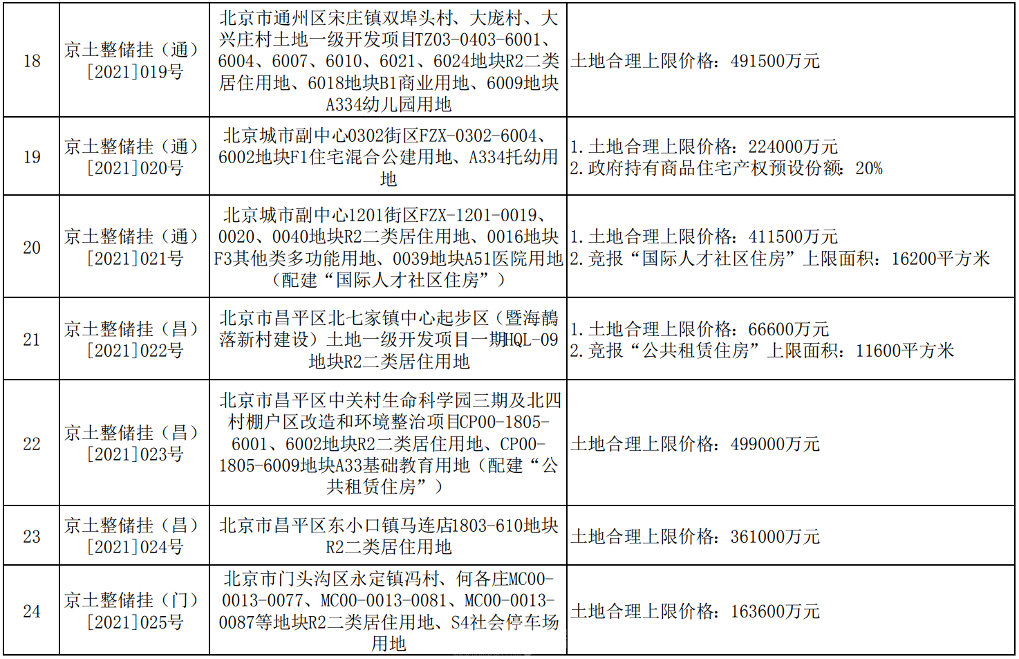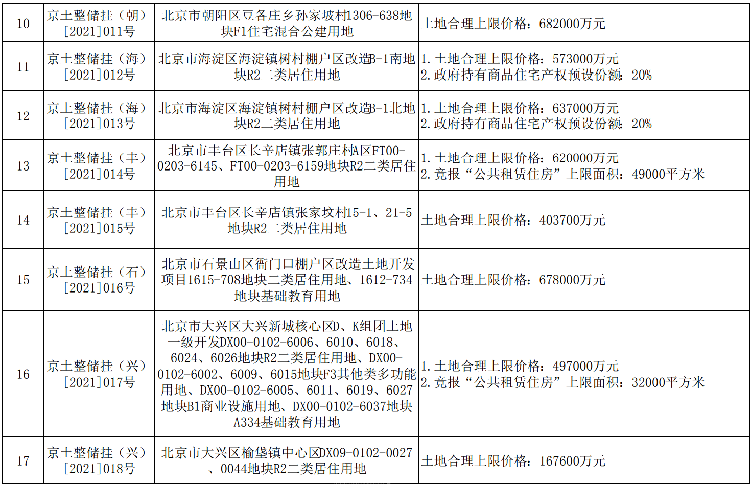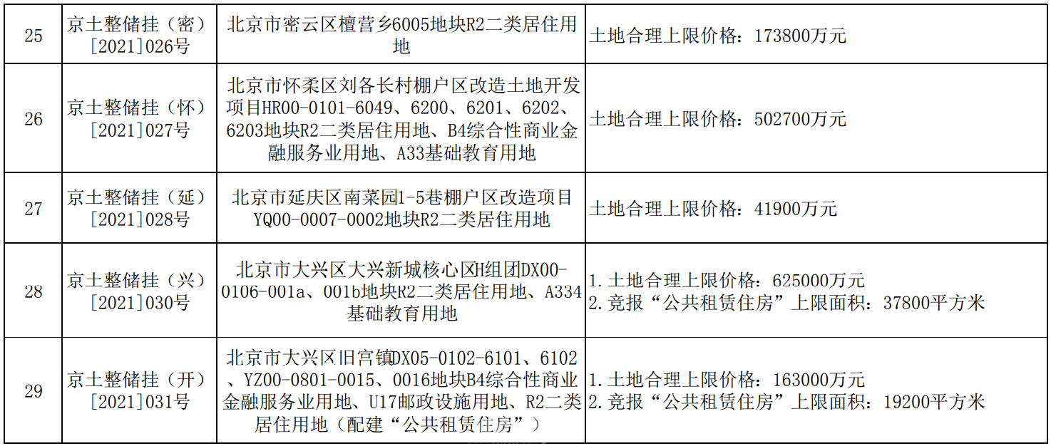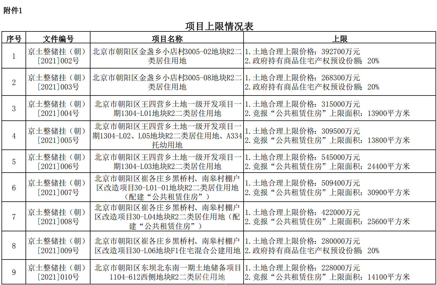 一、公布北京市朝阳区金盏乡小店村3005-02地块R2二类居住用地等29宗用地国有建设用地使用权出让挂牌文件中涉及的土地合理上限价格、政府持有商品住宅产权预设份额、竞报“公共租赁住房面积”上限面积及竞报“国际人才社区住房”上限面积。 (详见附件1)