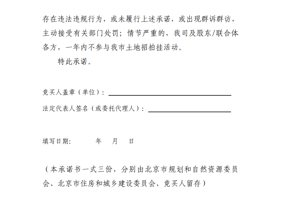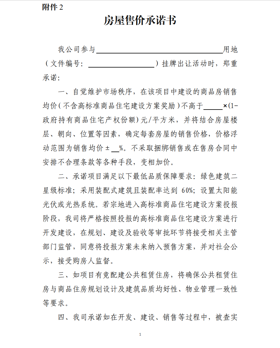二、公布第一条中北京市朝阳区金盏乡小店村3005-02地块R2二类居住用地等29宗用地国有建设用地使用权出让挂牌文件中涉及竞买人须提交的《房屋售价承诺书》模板。(详见附件2)