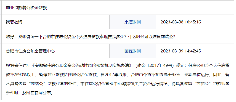 合肥市住房公积金管理中心回复:根据省住建厅《安徽省住房公积金资金流动性风险预警机制实施办法》(建金〔2017〕49号)规定:住房公积金个人住房贷款率在90%以上,暂停商业贷款转住房公积金贷款。自2017年以来,合肥市个贷率始终高于95%,长期高位运行。因此,暂不具备恢复“商转公”贷款业务的条件。市住房公积金管理中心将持续关注资金运行情况,待具备恢复“商转公”贷款业务条件时,及时在官网公布。