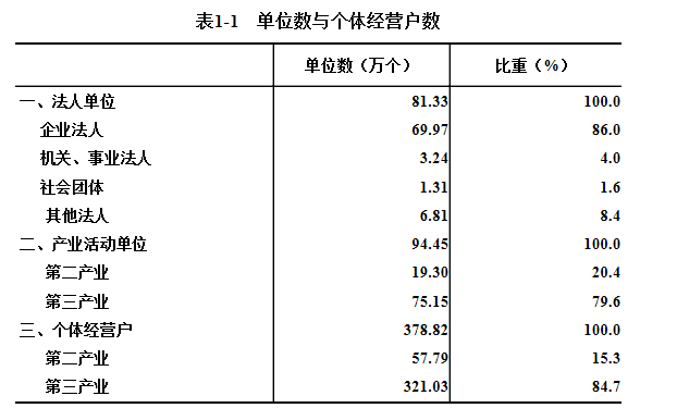 2018年末,全省共有从事第二产业和第三产业活动的法人单位81.33万个,比2013年末(2013年是第三次全国经济普查年份,下同)增加46万个,增长130.3%;产业活动单位94.45万个,增加49.95万个,增长112.2%;个体经营户378.82万个,增长39.3%(详见表1-1)。