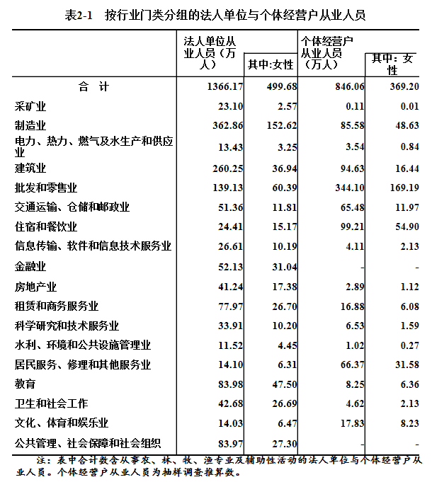 在法人单位从业人员中,位居前三位的行业是:制造业362.86万人,占26.6%;建筑业260.25万人,占19.1%;批发和零售业139.13万人,占10.2%。在个体经营户从业人员中,位居前三位的行业是:批发和零售业344.1万人,占40.7%;住宿和餐饮业99.21万人,占11.7%;建筑业94.63万人,占11.2%(详见表2-1)。