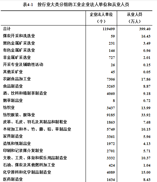 在工业企业法人单位从业人员中,采矿业占5.8%,制造业占90.8%,电力、热力、燃气及水生产和供应业占3.4%。在工业行业大类中,纺织服装服饰业、电气机械和器材制造业、非金属矿物制品业从业人员数位居前三位,分别占8.5%、7.6%和7.5%(详见表4-1)。
