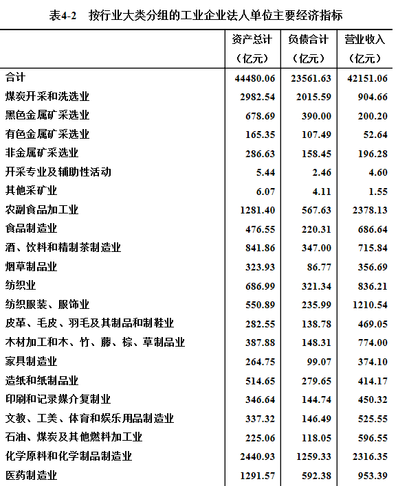 2018年末,工业企业法人单位资产总计44480.06亿元,比2013年末增长47.6%。负债合计23561.63亿元。全年实现营业收入42151.06亿元(详见表4-2)。