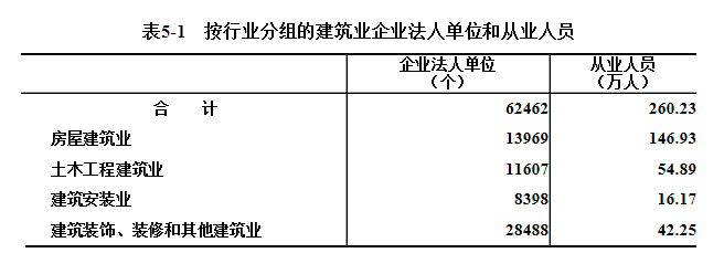 建筑业企业法人单位从业人员中,房屋建筑业占56.5%,土木工程建筑业占21.1%,建筑安装业占6.2%,建筑装饰、装修和其他建筑业占16.2%(详见表5-1)。