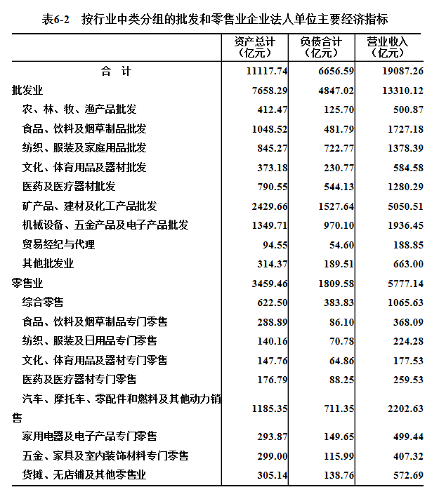 2018年末,批发和零售业企业法人单位资产总计11117.74亿元,比2013年末增长67.9%。其中,批发业企业法人单位资产总计7658.29亿元,零售业企业法人单位资产总计3459.46亿元,分别比2013年末增长73.8%和56.4%。负债合计6656.59亿元。全年实现营业收入19087.26亿元(详见表6-2)。