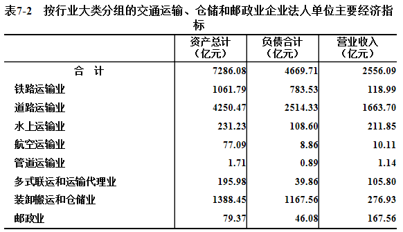 2018年末,交通运输、仓储和邮政业企业法人单位资产总计7286.08亿元,比2013年末增长74.4%。负债合计4669.71亿元。全年实现营业收入2556.09亿元(详见表7-2)。