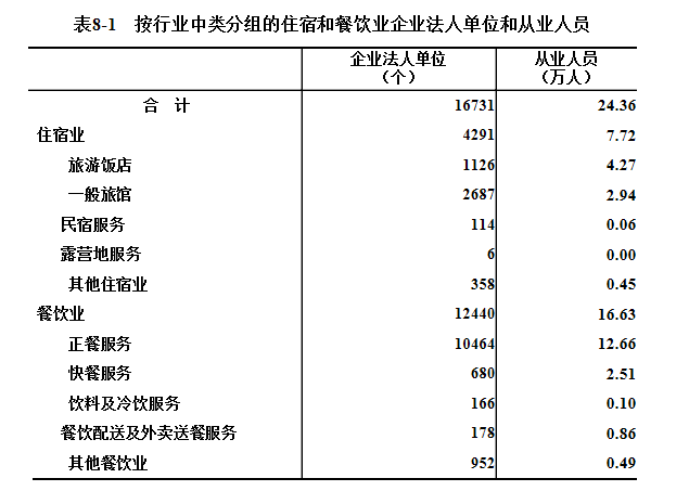 在住宿和餐饮业企业法人单位中,住宿业占25.6%,餐饮业占74.4%。在住宿和餐饮业企业法人单位从业人员中,住宿业占31.7%,餐饮业占68.3%(详见表8-1)。