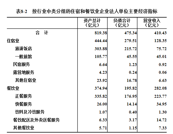 2018年末,住宿和餐饮业企业法人单位资产总计为819.38亿元,比2013年末增长32.3%。其中,住宿业企业法人单位资产总计444.44亿元,餐饮业企业法人单位资产总计374.94亿元,分别比2013年末增长23.1%和45.2%。负债合计475.34亿元。全年实现年营业收入410.43亿元(详见表8-2)。