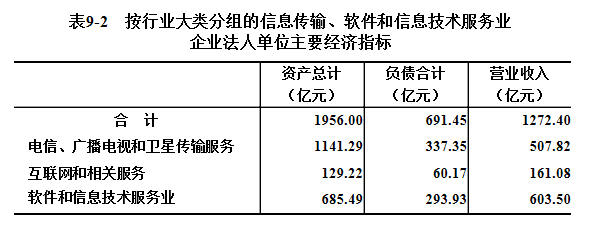 2018年末,信息传输、软件和信息技术服务业企业法人单位资产总计1956亿元,比2013年末增长163.9%。负债合计691.45亿元。全年实现营业收入1272.4亿元(详见表9-2)。