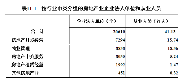 2018年末,全省房地产业企业法人单位的从业人员为41.13万人,比2013年末增长48.5%。其中,房地产开发经营企业15.74万人,物业管理企业18.36万人,房地产中介服务企业5.24万人,分别比2013年末增长16.4%、68%和194.4%(详见表11-1)。