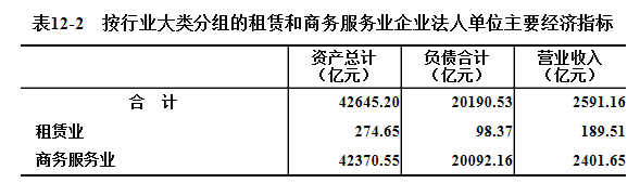 2018年末,租赁和商务服务业企业法人单位资产总计42645.2亿元,比2013年末增长220.2%。其中,租赁业企业法人单位资产总计274.65亿元,商务服务业企业法人单位资产总计42370.55亿元。负债合计20190.53亿元。全年实现营业收入2591.16亿元(详见表12-2)。