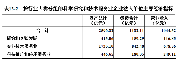 2018年末,科学研究和技术服务业企业法人单位资产总计2596.82亿元,比2013年末增长144%。负债合计1182.11亿元。全年实现营业收入1044.52亿元(详见表13-2)。