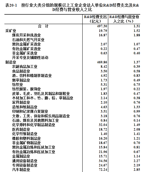 2018年,规模以上工业企业法人单位R&D经费支出497.3亿元,比2013年增长100.8%;R&D经费与营业收入之比为1.31%。规模以上工业企业法人单位分行业R&D经费支出及R&D经费与营业收入之比详见表20-1。