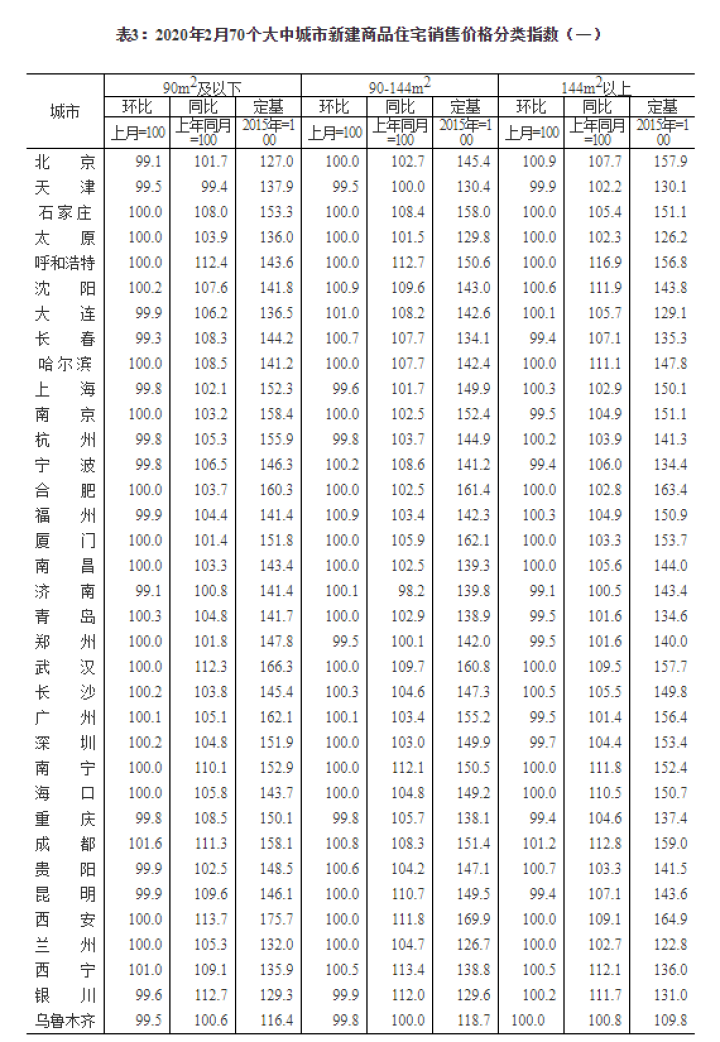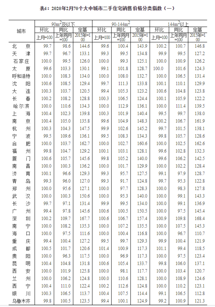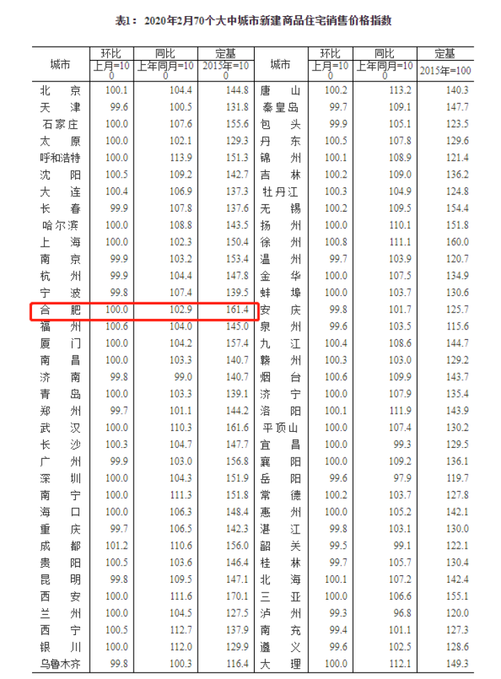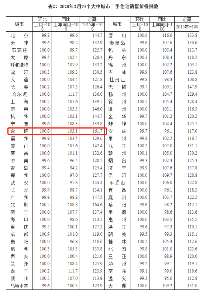 国家统计局今日发布了2020年2月份70个大中城市商品住宅销售价格变动情况统计数据。其中合肥新房房价数据环比为零,二手房环比为零。