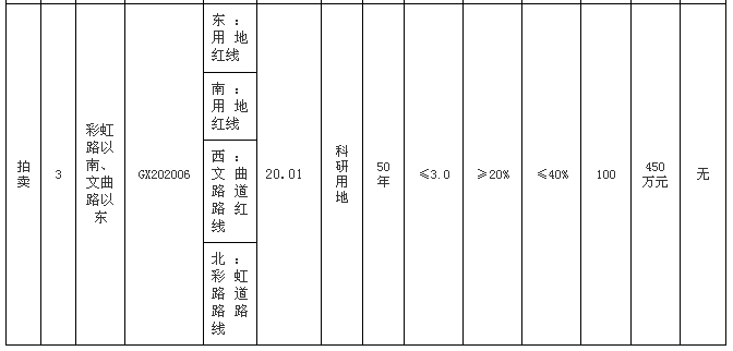 高新区GX202006号地块们于彩虹路以南、文曲路以东,面积20.01亩,竞买人须为注册资本金不低于1亿元人民币的公司法人。