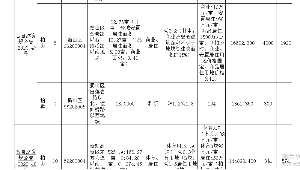 2020年9月合肥供地计划处出炉,计划推10宗1052.63亩地,参考总价51.4亿元。