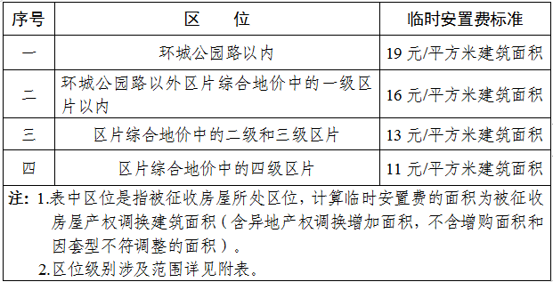 一级为环城公园路以内,临时安置费标准是19元/平方米建筑面积,包含三孝口街道和逍遥津街道。