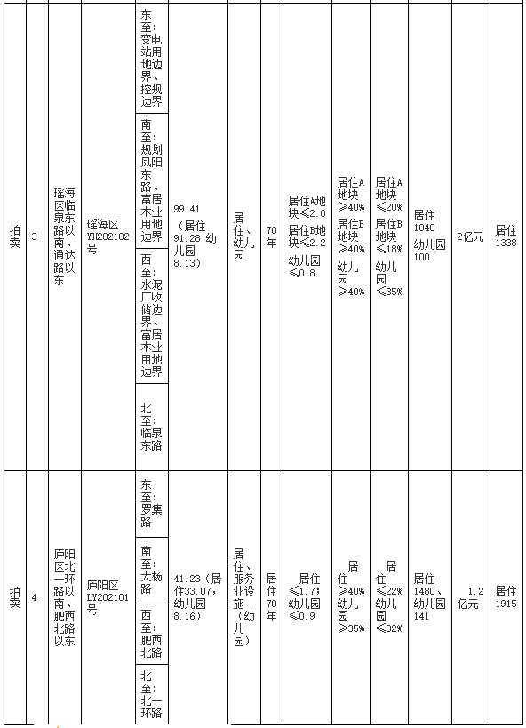 3、瑶海区YH202102号、庐阳区LY202101号地块拍卖方式为“价高者得+最高限价时转竞自持用于租赁的商品住房”。