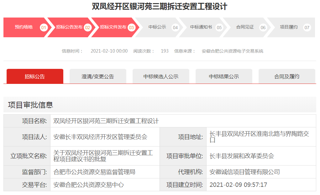 从合肥市公共资源交易中心获悉,长丰(双凤)经开区银河苑三期拆迁安置工程设计招标公告正式发布,长丰又一处安置小区“上线”啦!