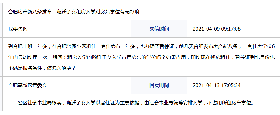 合肥高新区管委会回复:经区社会事业局核实,随迁子女入学以居住证为主要依据,由社会事业局统筹安排入学,不占用所租房产学位。