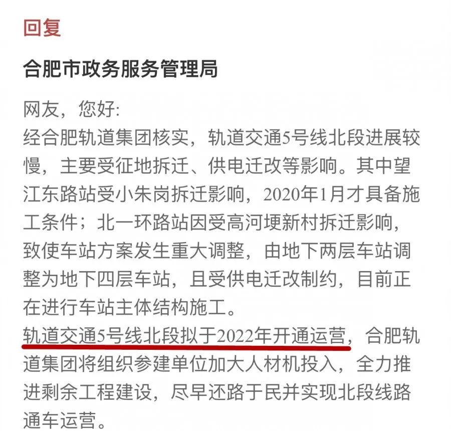 轨道交通5号线北段拟于2022年开通运营,合肥轨道集团将组织参建单位加大人材机投入,全力推进剩余工程建设,尽早还路于民并实现北段线路通车运营。