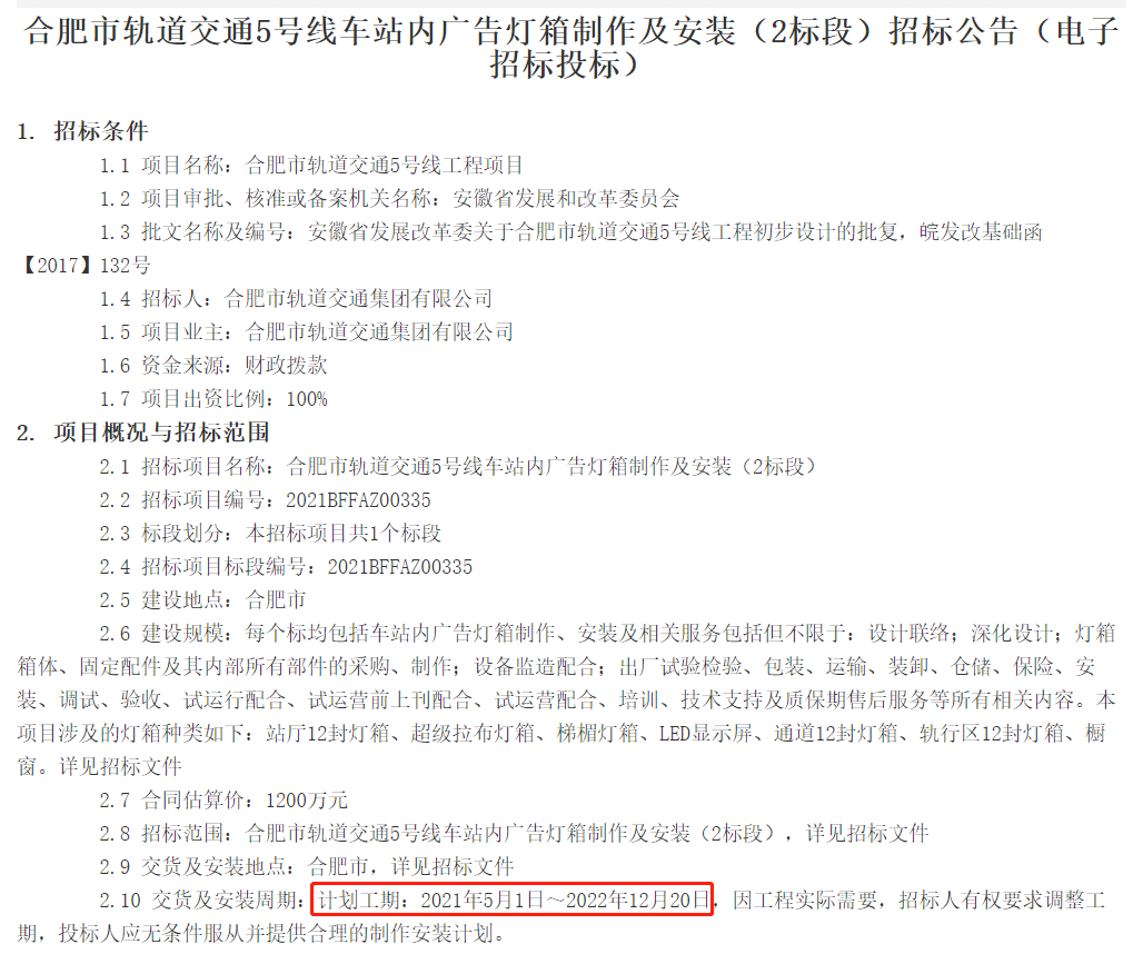 另外,据安徽合肥公共资源交易中心显示,合肥地铁5号线北段车站内广告灯箱制作及安装项目正在招标公示,据招标文件显示:地铁5号线车站内广告灯箱制作及安装项目计划工期为:2021年5月1日~2022年12月20日。