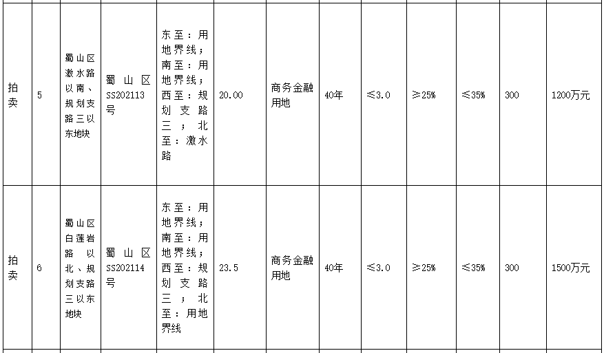 1、蜀山区SS202109号、蜀山区SS202111号、蜀山区SS202112号、蜀山区SS202114号地块竞买人须为注册资本金不低于1亿元的企业法人。