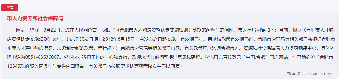对此,8月27日,合肥市人力资源和社会保障局回复称,目前,根据《合肥市人才购房资格认定实施细则》文件,此文件印发日期为2018年8月15日,自发布之日起实施,有效期三年。目前该政策有效期已过,合肥市房管局等相关部门将根据合肥市实际人才落户购房情况,加紧制定新的政策,请持续关注合肥市房管局等相关部门官网。