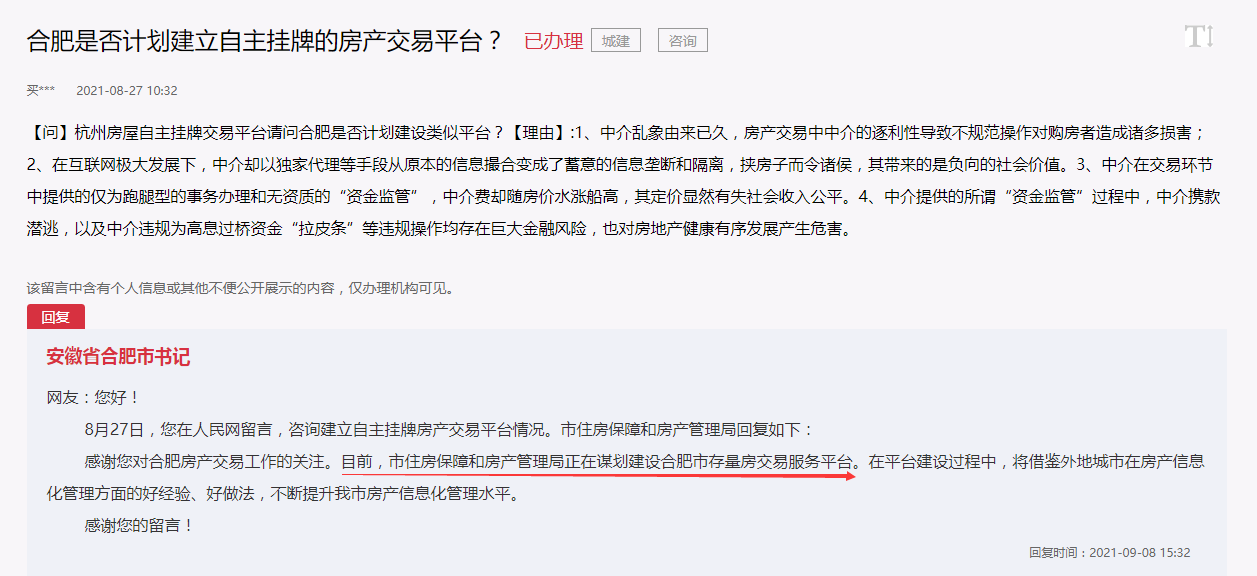 近日,有市民在人民网领导留言板咨询合肥是否计划建立自主挂牌的房产交易平台相关情况,获得了官方回复。
