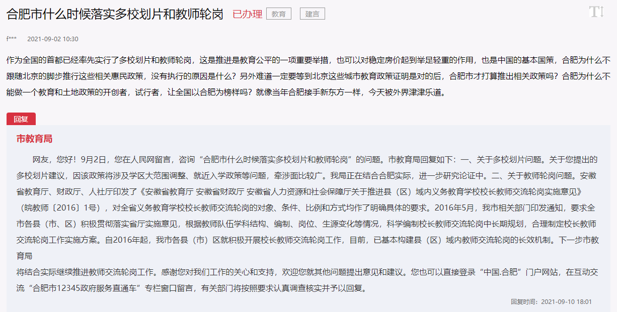 近日,有网友在人民网“领导留言板”留言:称首都北京已经率先实行了多校划片和教师轮岗,这是推进是教育公平的一项重要举措,也可以对稳定房价起到举足轻重的作用,也是中国的基本国策。合肥市什么时候落实“多校划片”和“教师轮岗”?
