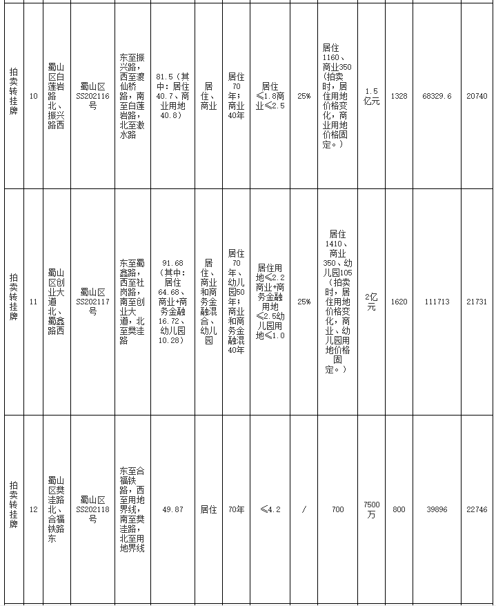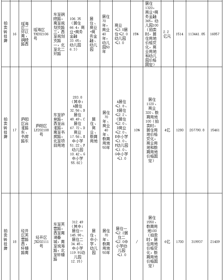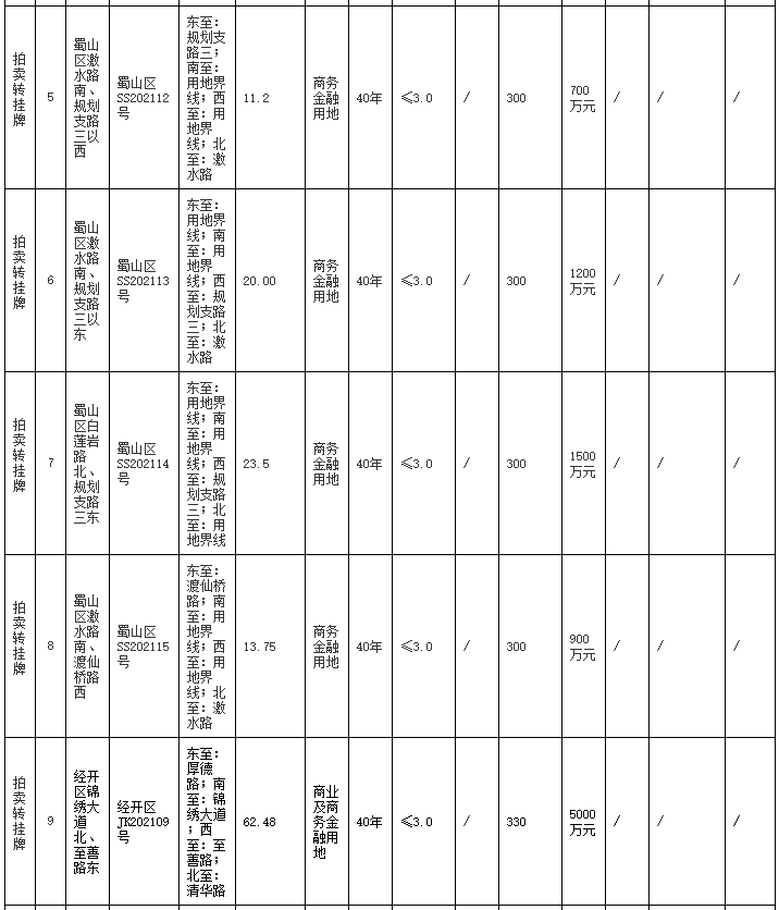 根据市土地管理委员会决定,其中高新区GX202107号,蜀山区SS202109号、SS202110号、SS202111号、SS202112号、SS202113号、SS202114号、SS202115号、SS202116号、SS202117号、SS202118号,经开区JK202109号、JK202111号,新站区XZ202107号、XZ202108号,瑶海区YH202105号、YH202106号和庐阳区LY202108号等宗地由拍卖出让转为现场挂牌出让。挂牌日期为2021年9月16日至2021年9月29日,挂牌时间为上午9:00-11:00、下午3:00-5:00。挂牌截止转入现场竞价时间为2021年9月29日下午2:30时。