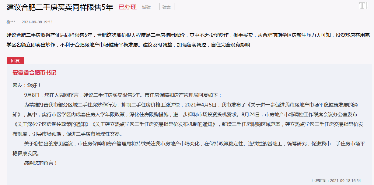 对此,合肥市住房保障和房产管理局回复称,为精准打击合肥市部分区域二手住房炒作行为,抑制二手住房价格上涨过快,2021年4月5日,合肥市发布了《关于进一步促进合肥市房地产市场平稳健康发展的通知》,其中,实行市区学区内成套住房入学年限政策,深化住房限购措施,进一步抑制市场投资投机需求。8月24日,市房地产市场调控工作联席会议办公室发布《关于深化学区房调控政策的通知》《关于建立热点学区二手住房交易指导价发布机制的通知》,新增二手住房限购区域范围,建立热点学区二手住房交易指导价发布制度,引导市场预期,促进二手房市场理性交易。