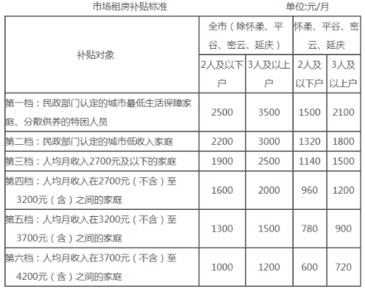 (一)市场租房补贴标准《关于调整本市市场租房补贴申请条件及补贴标准的通知》(京建法〔2020〕6号):