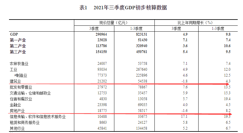 10月19日,国家统计局发布2021年三季度国内生产总值(GDP)初步核算结果。三季度建筑业GDP同比下滑1.8%,房地产业GDP同比下滑1.6%。