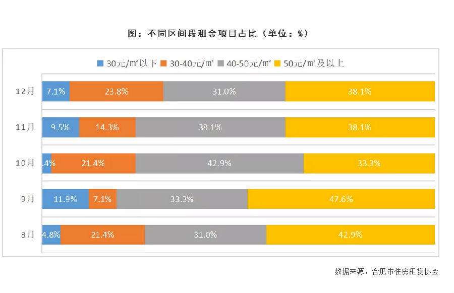 2021年12月,新出租租赁用房租金环比下降0.3%,单平米租金总体维持稳定。38.1%的项目单平米月租金在50元及以上,与上月持平;23.8%的项目单平米月租金在30-40元之间,环比上升9.5个百分点;31.0%的项目单平米月租金在40-50元之间,环比下降7.1个百分点。