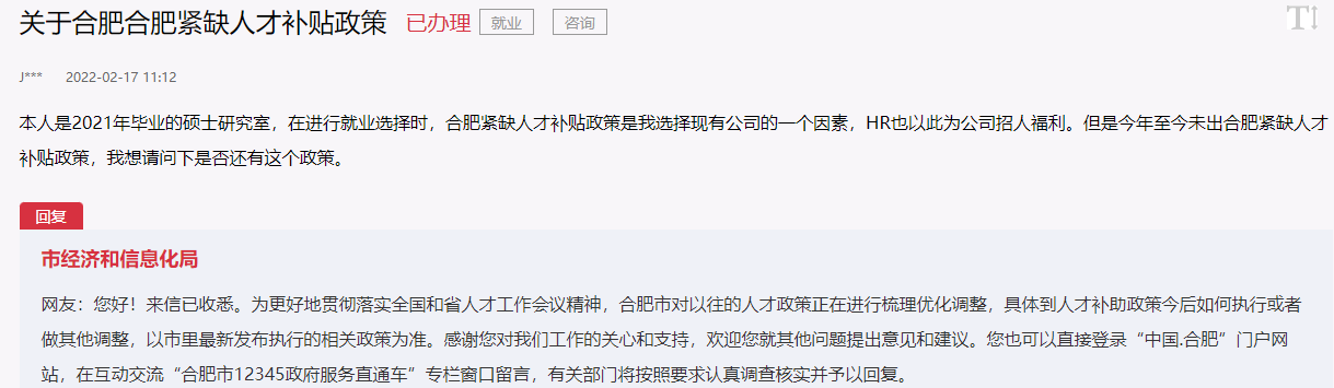 近日,有网友在人民网留言,称其是2021年毕业的硕士研究生,在进行就业选择时,合肥紧缺人才补贴政策是其选择现有公司的一个因素,HR也以此为公司招人福利。但是今年至今未出合肥紧缺人才补贴政策,想请问下是否还有这个政策?