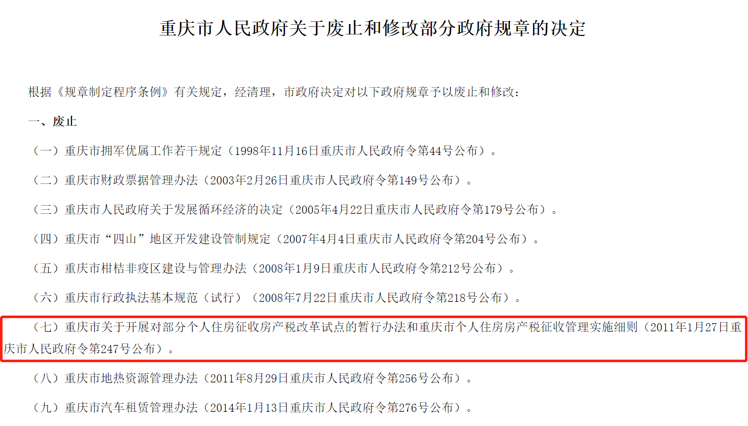 近日,重庆市政府发布《重庆市人民政府关于废止和修改部分政府规章的决定》,其中提到废止重庆市关于开展对部分个人住房征收房产税改革试点的暂行办法和重庆市个人住房房产税征收管理实施细则(2011年1月27日重庆市人民政府令第247号公布)。