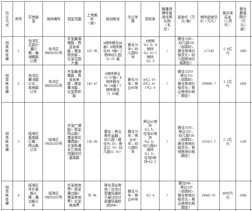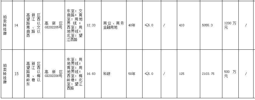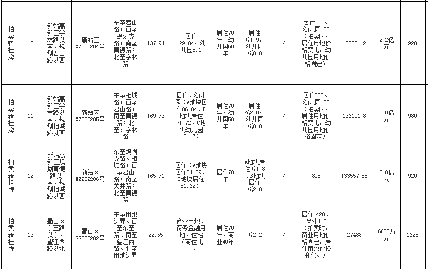 合肥市自然资源和规划局于2022年2月15日在合肥土地市场网等相关媒体发布了《合肥市国有建设用地使用权出让公告》(合自然资规公告 [2022] 6号和7号),公告以拍卖方式出让包河区BH202201号、02号;瑶海区YH202202号、03号;新站区XZ202201号、02号、03号、04号、05号、06号;庐阳区LY202201号、04号;蜀山区SS202202号;高新区GX202205号、06号宗地。