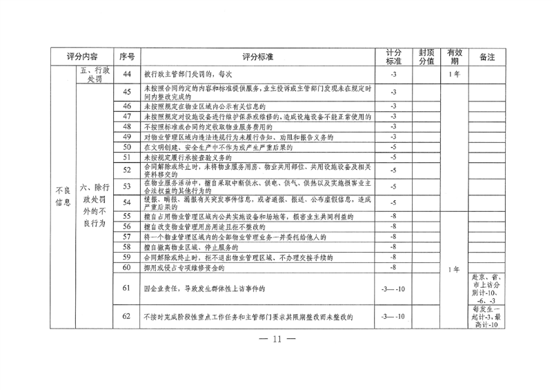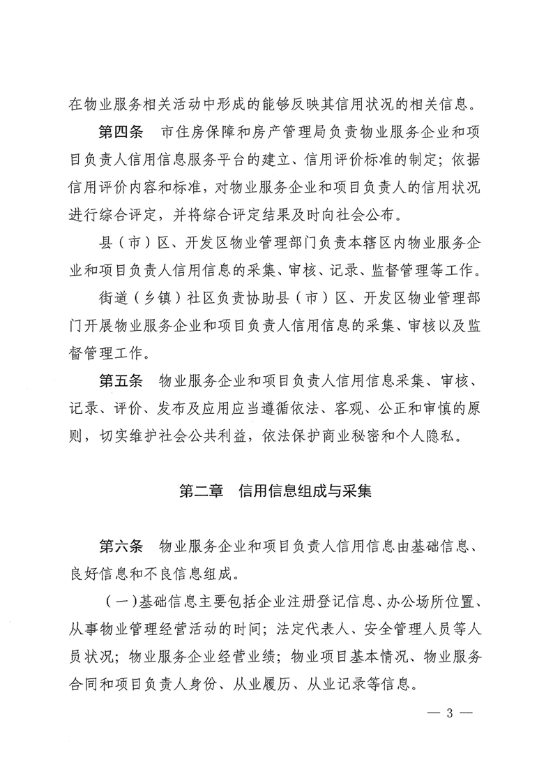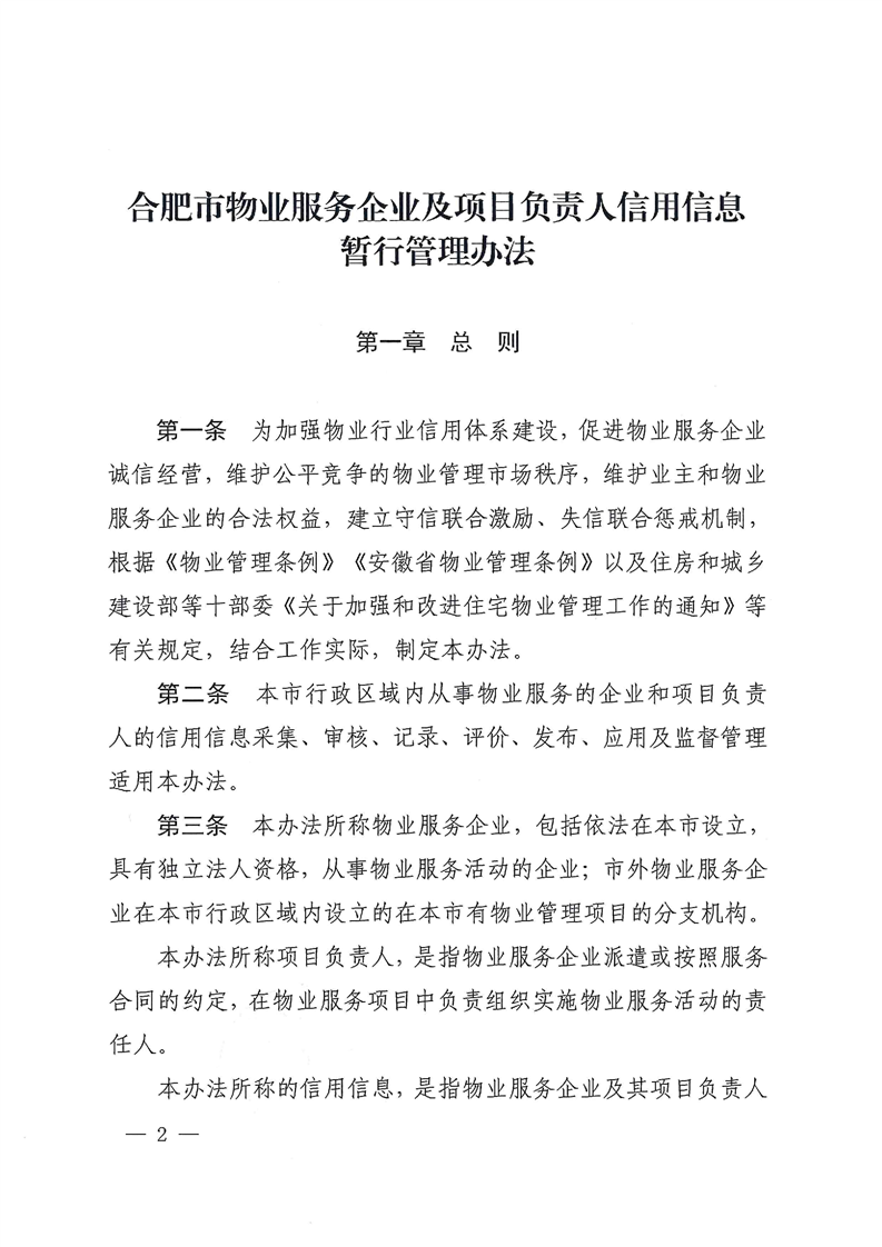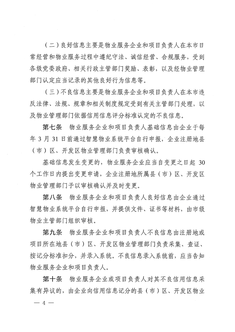 《办法》指出,物业服务企业和项目负责人信用信息由基础信息、良好信息和不良信息组成。其中,基础信息主要包括企业注册登记信息、办公场所位置、从事物业管理经营活动的时间,法定代表人、安全管理人员等人员状况,物业服务企业经营业绩等信息。良好信息主要是物业服务企业和项目负责人在合肥市日常经营和物业服务过程中遵纪守法、诚信经营、合规服务,受到各级党委政府、相关行政主管部门奖励、表彰,以及经物业管理部门认定应当记录的其他良好行为信息等。