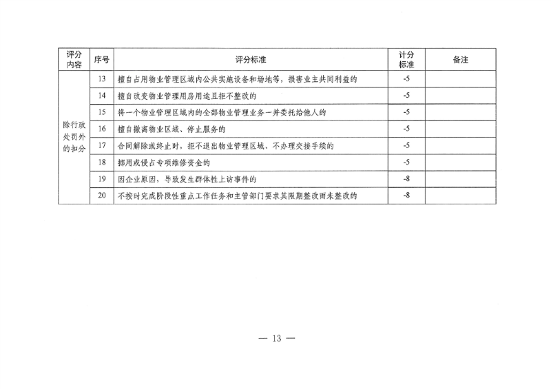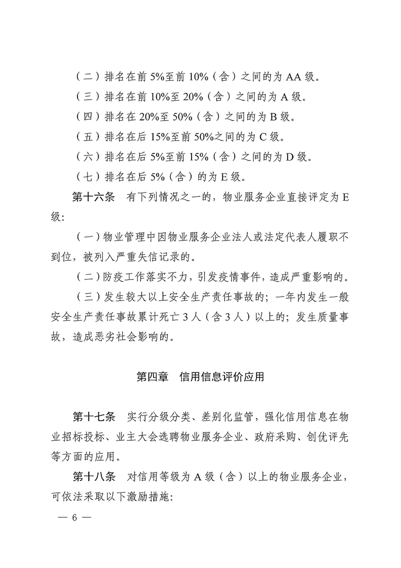 物业服务企业信用等级按参评企业数信用信息得分排序确定:排名在前5%(含)的为AAA级。排名在前5%至前10%(含)之间的为AA级。排名在前10%至20%(含)之间的为A级。排名在20%至50%(含)之间的为B级。排名在后15%至前50%之间的为C级。排名在后5%至前15%(含)之间的为D级。排名在后5%(含)的为E级。
