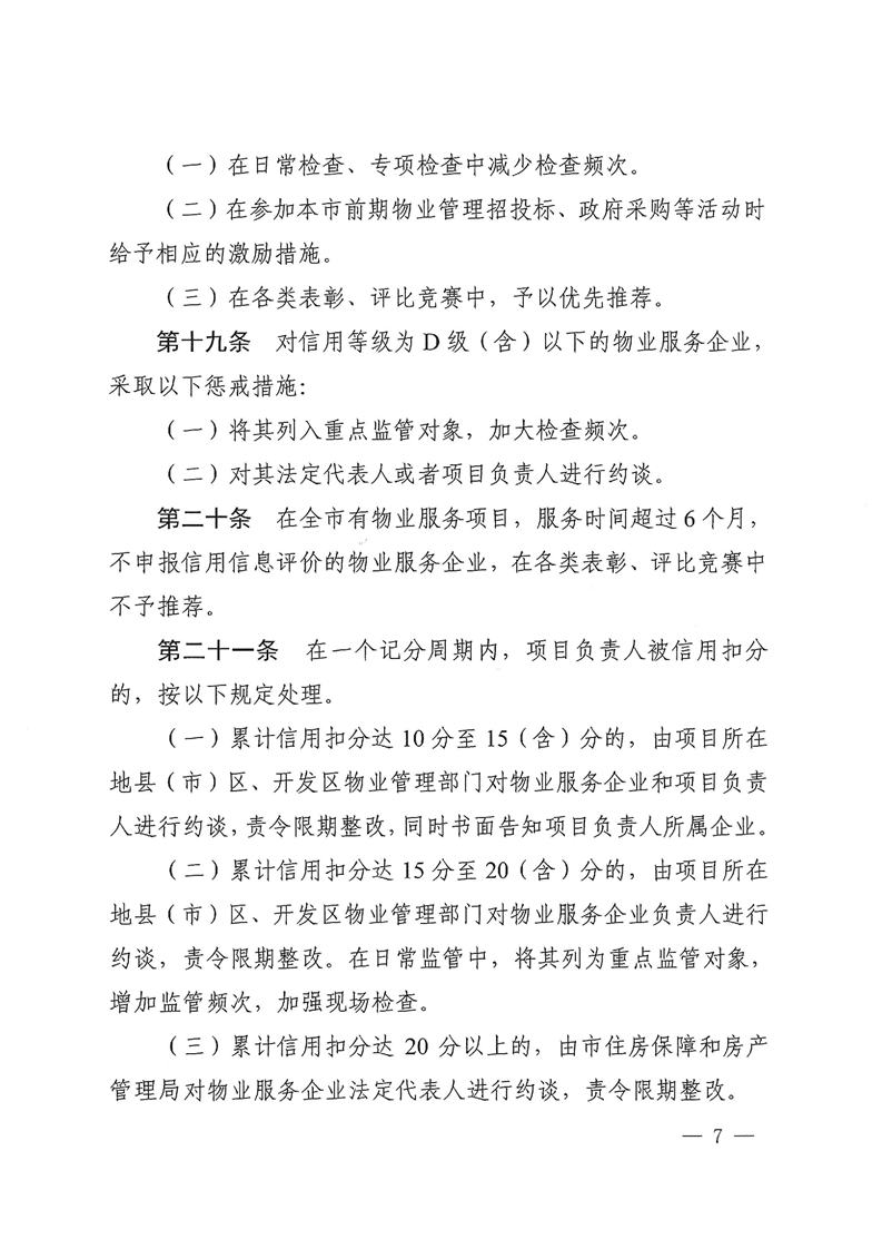 对信用等级为D级(含)以下的物业服务企业,采取以下惩戒措施:将其列入重点监管对象,加大检查频次。对其法定代表人或者项目负责人进行约谈。在全市有物业服务项目,服务时间超过6个月,不申报信用信息评价的物业服务企业,在各类表彰、评比竞赛中不予推荐。