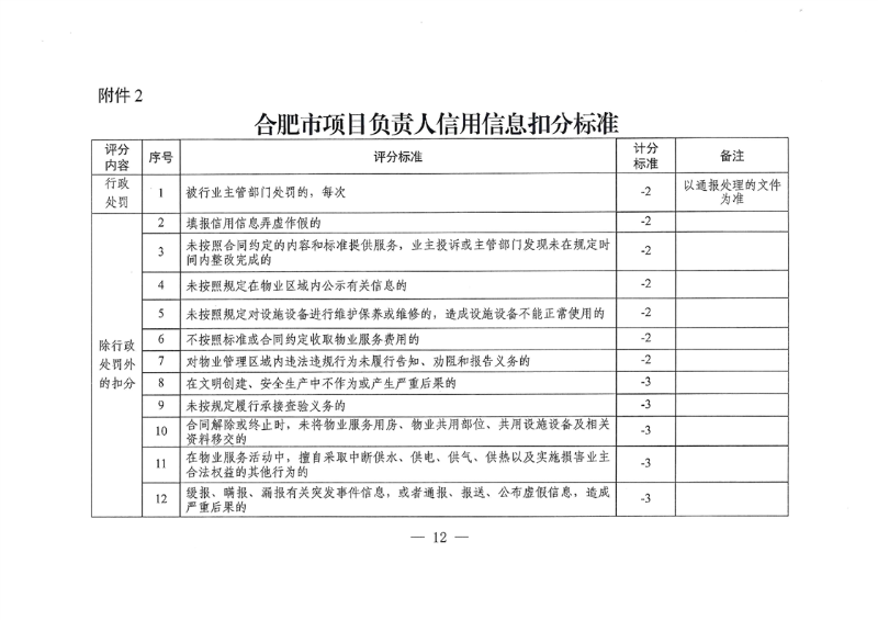 在一个记分周期内,项目负责人被信用扣分的,累计信用扣分达15分至20(含)分的,由项目所在地县(市)区、开发区物业管理部门对物业服务企业负责人进行约谈,责令限期整改。在日常监管中,将其列为重点监管对象,增加监管频次,加强现场检查。累计信用扣分达20分以上的,由合肥市住房保障和房产管理局对物业服务企业法定代表人进行约谈,责今限期整改。