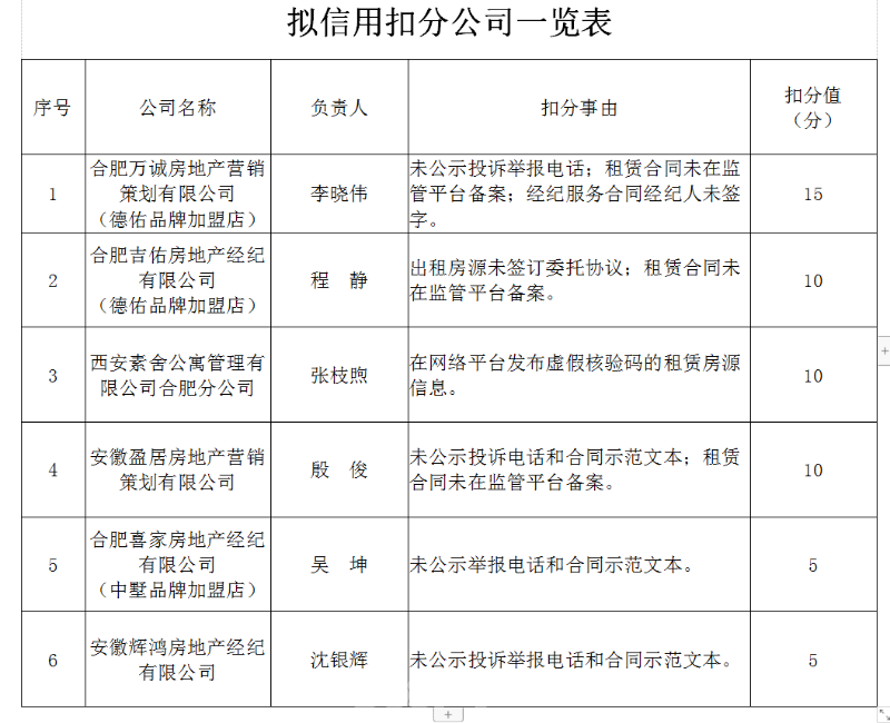 根据《合肥市房地产经纪行业信用考评暂行办法》(合房〔2018〕8号)文件规定,结合信访和执法检查,拟对相关公司和从业人员的不良经营行为给予信用扣分(名单附后),公示期从2019年12月4日-2019年12月10日,任何单位和个人如对不良行为信息信用扣分有异议的,可在公示期内向我局提出书面异议,并提供具有法律效力或事实依据的证明材料,逾期未收到,视为无意见。