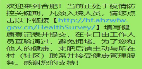 1、人员进入合肥市域后,收到通信运营商短信,提醒进行健康登记,点击链接地址进行登记