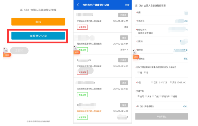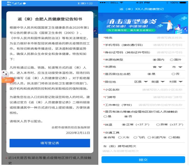 所有经由公路、铁路、航空、水路等方式的返(来)肥人员,进入本市时应主动接受体温检测,如实填写《健康登记表》。为提高通行效率,减少排队等待时间,请近期即将返(来)肥人员,在出发前或途中,提前通过手机网络填报个人健康登记信息(操作说明附后),并保留提交成功后的二维码截图,以备防控人员查验。