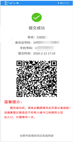 务必对提交成功之后的二维码进行截图保存,用于防控人员核验。(重要)