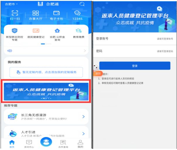 执勤点审核工作人员打开“皖事通”APP,选择区划到“合肥市”,找到首页“返来人员健康登记管理平台”,点击进入登录页面,输入审核账号、密码完成系统登录。