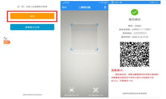 点击【审核】,出现二维码扫一扫,扫描申请人提供的返(来)合肥人员健康登记完成后生成的二维码即可;