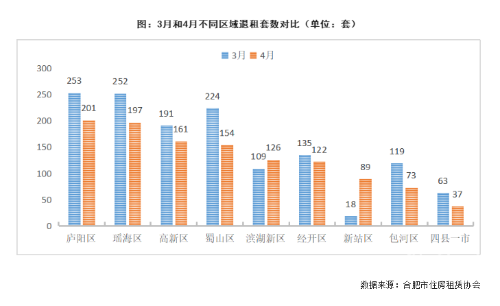 4月,72个长租公寓项目退租1160套,环比下降15.0%。从区域来看,庐阳区退租套数最多,退租201套;其次为瑶海区和高新区,分别退租197套和161套;四县一市退租最少,仅退租37套。与上月相比,除新站区和滨湖新区外,其他区域退租套数均出现下降。