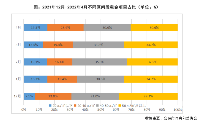 4月,签约租赁用房租金环比微涨1.6%。30.6%的项目单平米月租金在50元及以上,环比下降4.2个百分点;23.6%的项目在30-40元之间,上升4.2个百分点;15.3%的项目在30元以下,上升2.8个百分点。